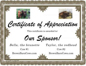 Your contribution here will be greatly appreciated! In recognition of your generosity, we will send you this genuine Cow Certificate!
